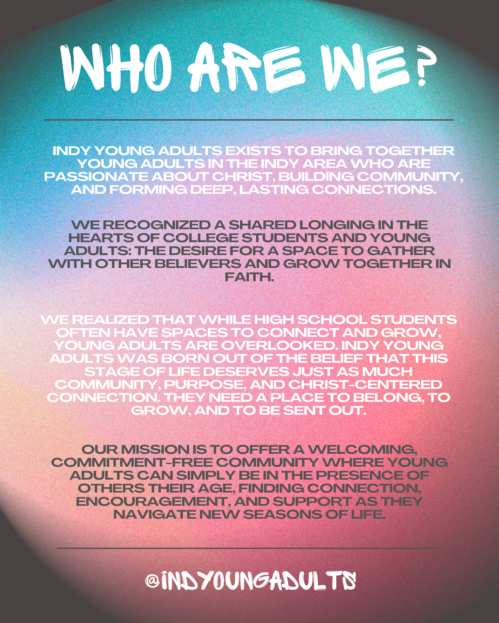 Our mission is to offer a welcoming, commitment-free community where young adults can simply be in the presence of others like them finding connection, encouragement, and support as they navigate new seasons of life.